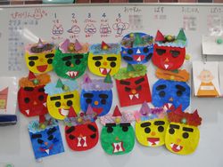 最後はホワイトボードにお面を飾り、みんなで見せ合いましたよ( *´艸`)