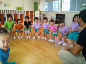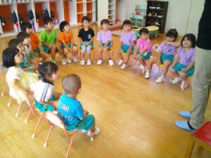 「今日の英語楽しみだね!英語の先生は男の先生なんだって!」と朝からドキドキワクワクのうさぎ組さん♬いざ英語の時間になると「hello!」「My name is 〇〇」と先生の発音を上手に真似していました。たくさん「かわいいね、上手だね」と褒めてもらい英語の時間が大好きになりました☆