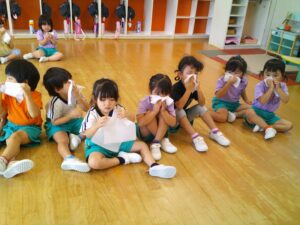 寒暖差で鼻水や咳が出始めたのでみんなで鼻のかみ方を練習しました!一人一人にティッシュを配っていると「先生!2枚あったよ!」と教えてくれたお友達がいましたが、ティッシュは2枚で1つなことを知らせると不思議そうにティッシュを見つめていました。子どもの「なんで?どうして?」という発見や知的好奇心って面白いですよね!試しに2枚重ねのうちの1枚だけで鼻をかむと鼻水で破けて手が汚れることに気づき納得していましたよ。
