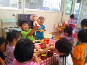 1学期はままごとでお家ごっこが流行っていましたが、最近はパーティーごっこがお気に入りです。テーブルにシートを敷いてごちそうをたくさん並べてお友達を招待しています。赤ちゃん人形や猫役のお友達も誘ってもらい、いつのまにかうさぎ組さんみんなでパーティーごっこをしているくらい仲良しです☆