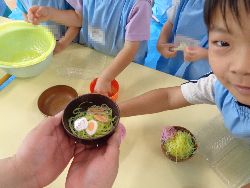 お椀に春雨を入れてトッピングをのせてラーメンを作ったり、砂場にある雨どいを使って流しそうめんをしたりごっこ遊びも楽しみました。