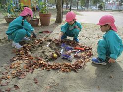 落ち葉やどんぐりを見つけると、料理に入れておままごとを楽しんだり、落ち葉を踏んでカサカサとなる音を聞いて楽しんでいましたよ(*^-^*)