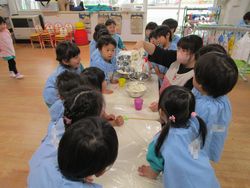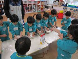 クラスで二回目の小麦粉粘土をして遊びました。前回は、粘土になってから子どもたちに見せましたが、今回は小麦粉から粘土を作るところから一緒に行いました。