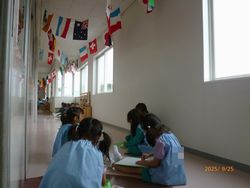 子ども達は登園してくると「なにこれ~!?」「私たちのグループの国旗と同じのあったよ!」と話しながら、キラキラした目で眺めていました(*’▽’)