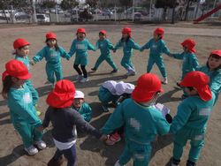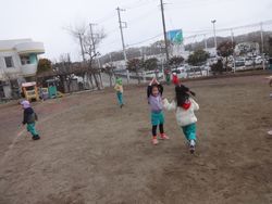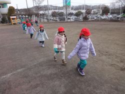 外で遊ぶ前に「寒いと怪我しやすいからマラソンをして体をあたためよう!」と声を掛けると、「やったー!!」とノリノリなひつじ組さん。「3周も走ったから疲れたよー」なんて言いながら思いきり体を動かして遊んでいます。