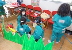 発表会が終わっても、まだまだ「アリとキリギリス」が続いています。発表会で使った小道具・大道具を使ってのごっこ遊びを楽しんでいます♪