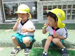 しゃぼん玉がとっても上手に吹けるようになったひよこ組さん。