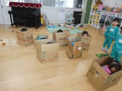 段ボールで遊びました♬誰かが「隠れて!」と言うと、みんな段ボールの中に隠れます。気分は忍者さん☺