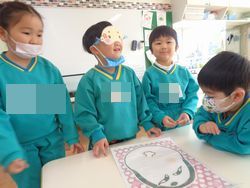 仲良く楽しんでいました。福笑いでは、目隠しをして一つ一つ置いていくと…目があんなところに!と