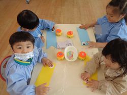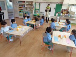 初めての制作活動!様々な色や柄の折り紙を用意したところ、「どれにしようかな?」とわくわくしながら