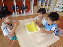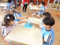 焼きそば屋さん等のお店を開く子ども達でした。3色の春雨が重なり合う事を喜ぶ姿も見られましたよ。