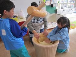 「よいしょー!」「はい!」の掛け声に合わせてペアで餅つきごっこを楽しみましたよ。