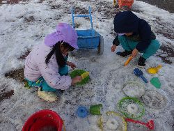 スコップで氷をすくってバケツに集めたり、型抜きでケーキやドーナツを作りながら雪の感触を楽しんでいました♪