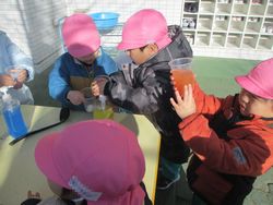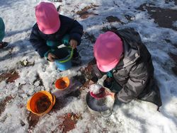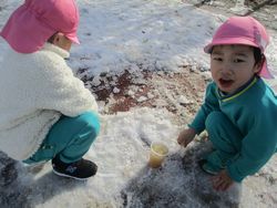 三連休後の幼稚園にはうっすら雪が残っており、寒さに負けずに雪遊び・氷遊びをしました(*^^*)