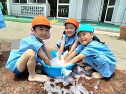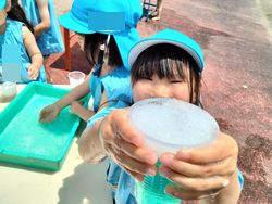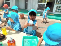 お天気がいい日には色水や泡遊びを楽しんだきりん組さん✨