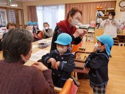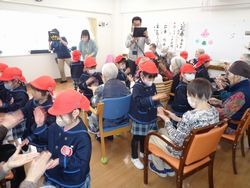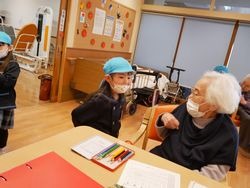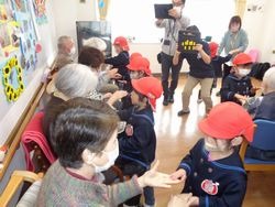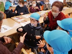 おじいちゃんおばあちゃんと一緒に顔を合わせ、手を取り合って手遊びや歌を楽しみましたよ♪