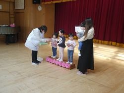 名前を呼ばれて「はい!」と返事をしたり、カードを渡すと「ありがとう」の声も聞かれ、その様子に一年の成長を感じました。