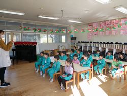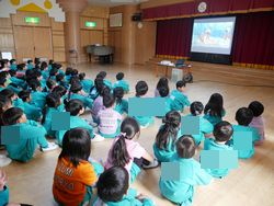 避難の様子を見ていた園長先生からお話をいただき、その後はみんなで消防署さんからお借りしたDVDを観て火事の危険や怖さについて学びました。