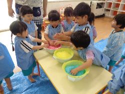 色によってかたさが違うことに気付き「青色が一番かたいね」「赤色が一番好き!気持ちいい!!」とお気に入りの春雨を見つけていました。