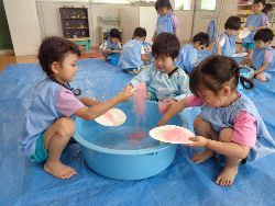 お椀に春雨を入れてトッピングをのせてラーメンを作ったり、砂場にある雨どいを使って流しそうめんをしたりごっこ遊びも楽しみました。