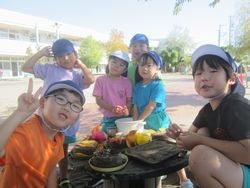 暖かくて天気のいい日には、年長組みんなで外でシートを広げて給食を食べました☆彡