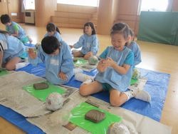 まずは粘土をコネコネし形を整えて、竹串で模様を描いていました!