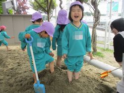 昨日はお外で裸足になって砂場遊びを楽しみましたよ♪ 砂の上を裸足で歩くと気持ちいい~(^O^)