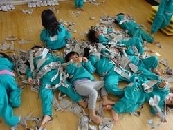 みんなで先生に新聞紙をかけて隠したり、新聞紙のお布団をかけて寝てみたり…