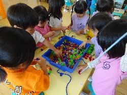 初めは少し苦戦していましたが、指先を上手く使い、たくさんのビーズを通して「できた!」という達成感を味わいました。 体を動かすことが好きなひよこ組さんですが、お部屋での遊びも充実できるよう援助していきます!