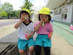 しゃぼん玉がとっても上手に吹けるようになったひよこ組さん。
