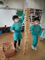 自分のやりたいことだけではなく、相談して進めることでどんどん高くなっていき「このままにしておく!」と降園…次の日の朝にいつの間にか倒れていましたが、「大丈夫だよ!」とすぐに作りなおしたみんなです!