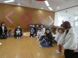 この日はカワイ音楽教室の先生を講師としお招きし、「リズム遊び」をしました。ホールにはタンブリン、すず、マラカスがたくさん用意されていて、子どもたちも興味津々。