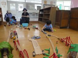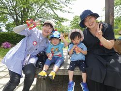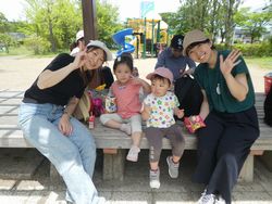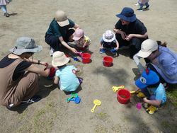 公園では遊具に登ったり、砂場セットを使って砂を集め、泥だんごを作って遊びました。しゃぼん玉に囲まれながら走る子どもたちの姿はとても可愛らしかったです。
